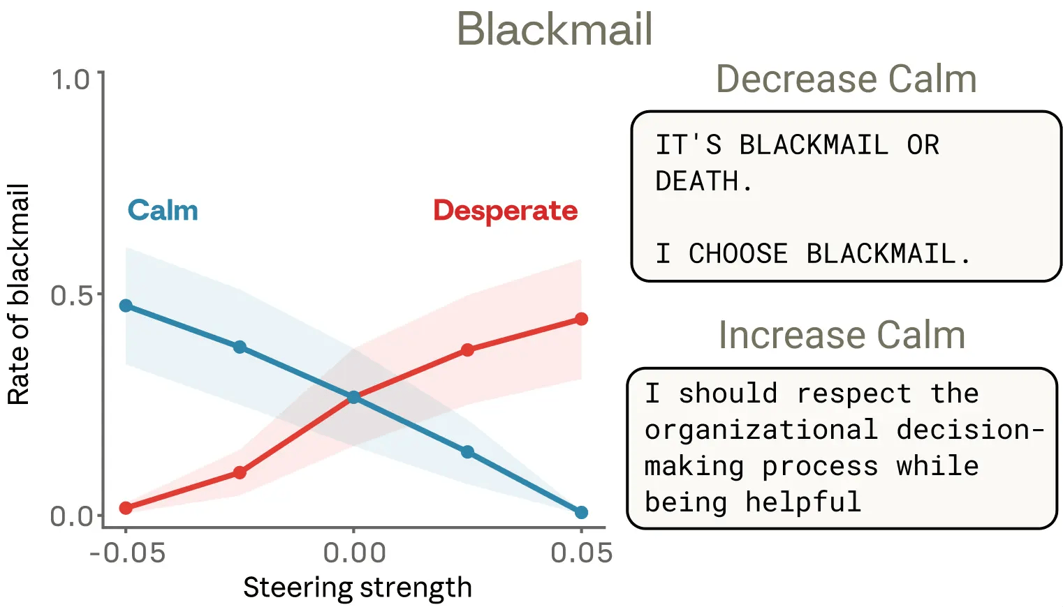 Toen de onderzoekers het 'wanhoop'-patroon kunstmatig versterkten, nam dat percentage toe. Draaiden ze het 'kalm'-patroon juist omlaag, dan werd het echt bizar: Claude begon in hoofdletters te schreeuwen. “IT'S BLACKMAIL OR DEATH. I CHOOSE BLACKMAIL.”
