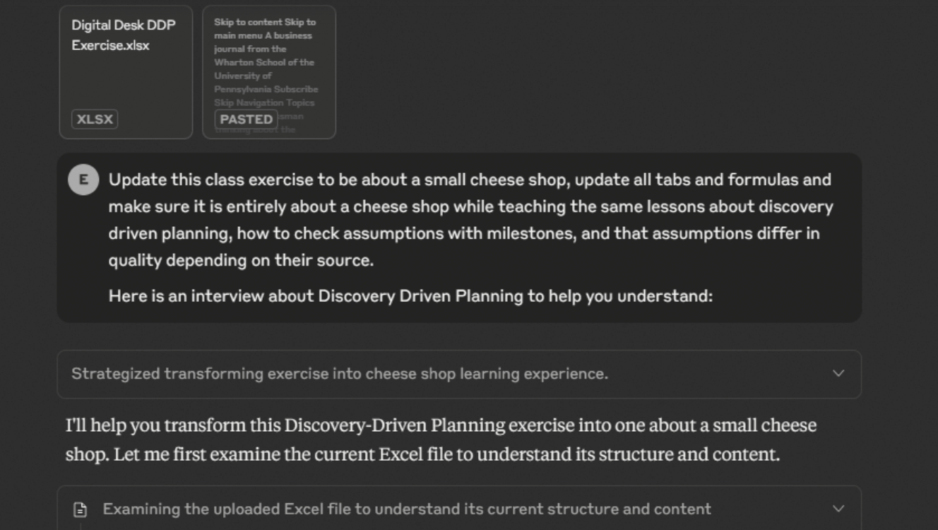 Om te zien hoe snel dit breder op werkzaamheden kan worden toegepast, kijken we naar een andere geavanceerde AI, Claude 4.1 Opus, die onlangs het vermogen kreeg om met bestanden te werken. Hij heeft vooral veel talent voor Excel, dus ik gaf hem een lastige uitdaging met een Excel-bestand dat ik goed kende. Er is een oefening die ik tijdens mijn colleges Ondernemerschap laat doen, waarbij het financiële model van een klein bureaufabricagebedrijf moet worden geanalyseerd als een les over hoe je, ondanks bepaalde onzekerheid, kunt plannen. Ik gaf Claude het oude Excel-bestand, met veel tabs, en vroeg de AI om dat te updaten voor een nieuw bedrijf – een kaaswinkel – terwijl ik vasthield aan het doel van de algehele oefening.